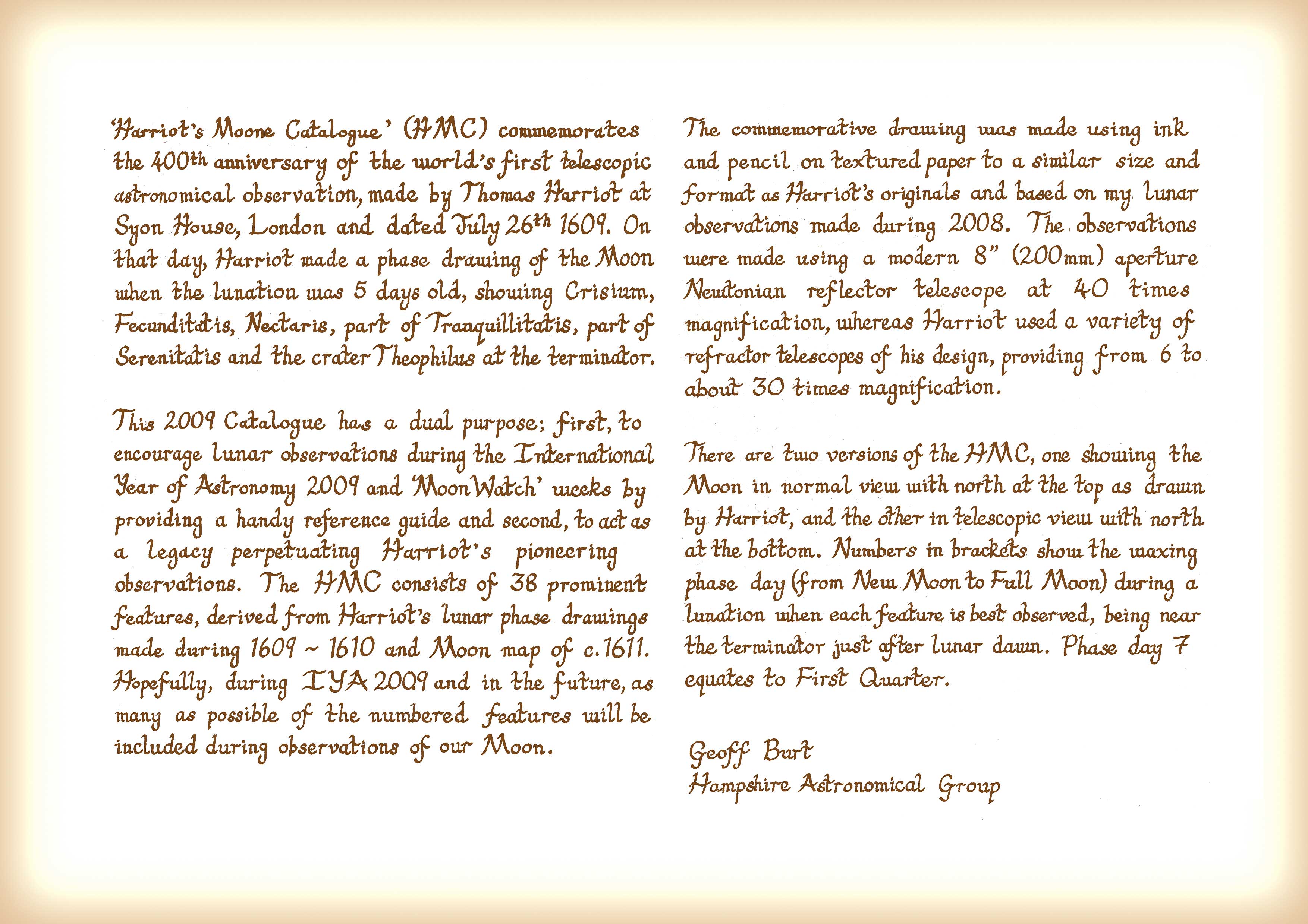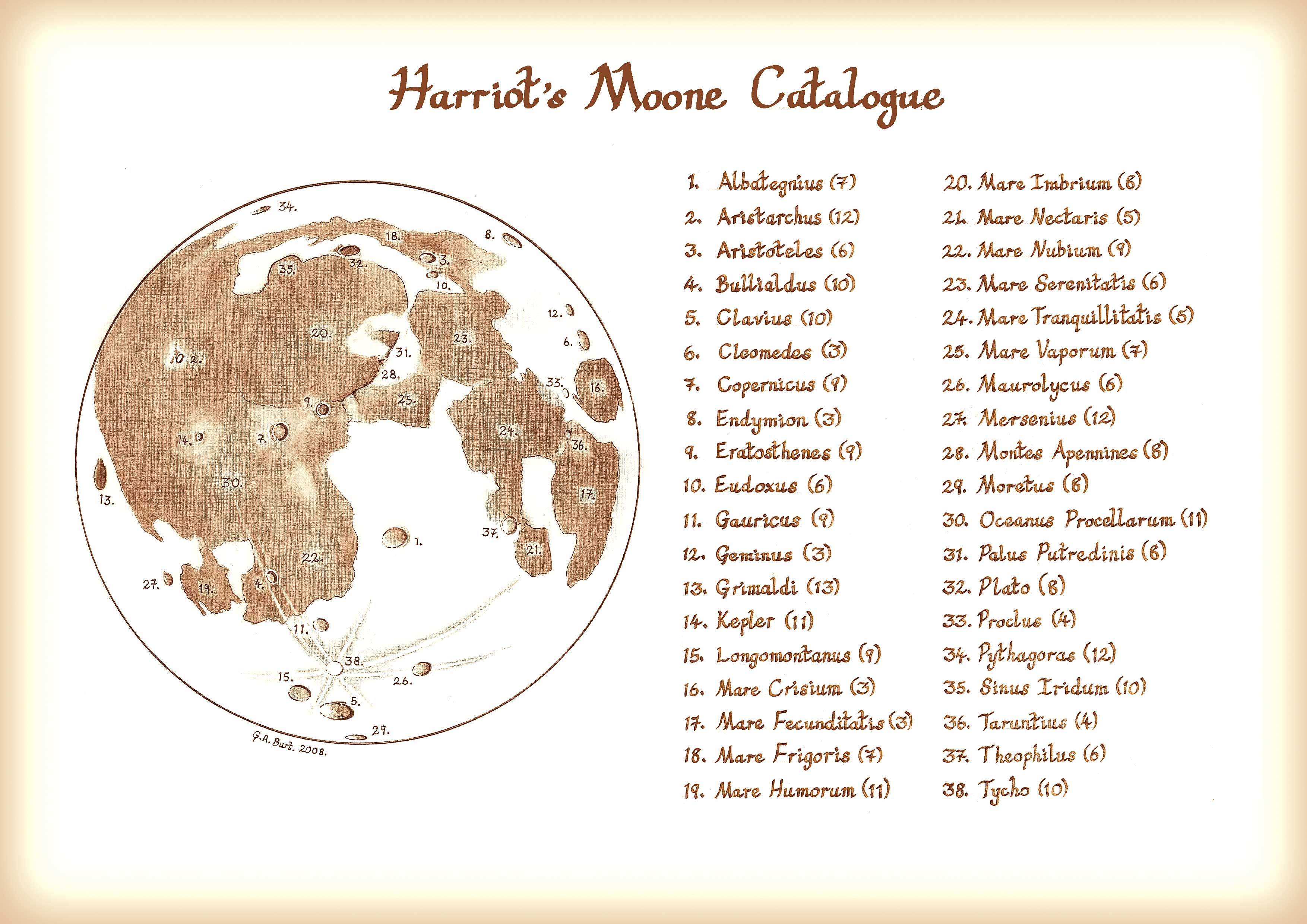 This 2009 Catalogue has a dual purpose; first to encourage lunar observations during the International Year of Astronomy 2009 and 'Moon Watch' weeks by providing a handy reference guide and second, to act as a legacy perpetuating Harriot's pioneering observations.